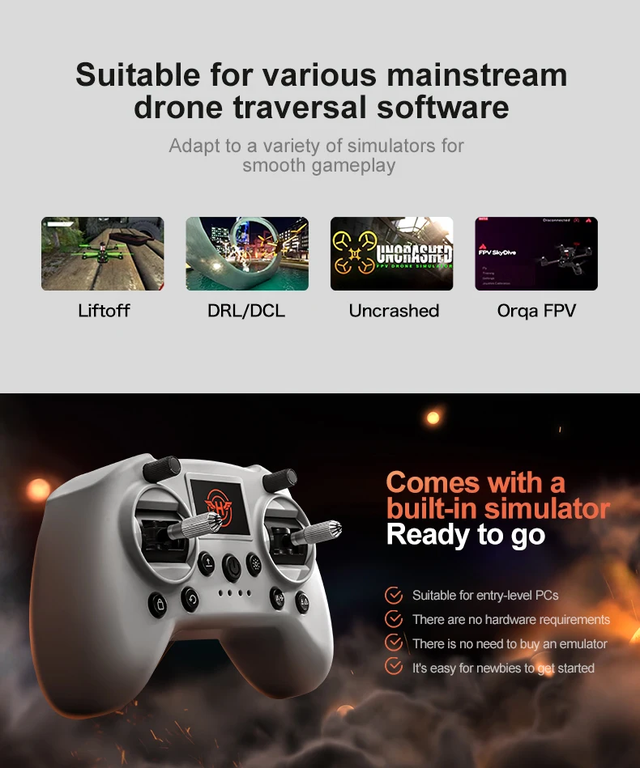 Сумісність з усіма популярними FPV-програмами: Liftoff, DRL, DCL, Freerider, FPV LOGIC, Velocidrone.